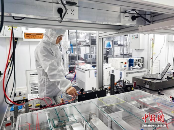 2月9日,中国先进阿秒激光设施超净实验室内,身着无尘服的科研人员对飞秒激光设备进行调试。中新网记者 许青青 摄