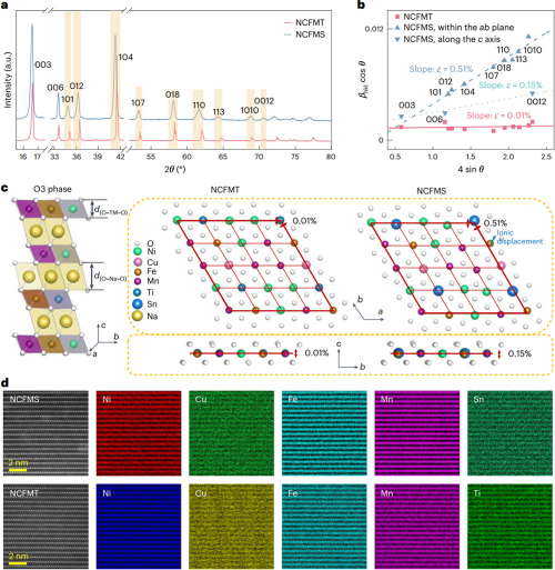 钠离子电池中正极材料的性能直接影响电池的循环寿命。传统的三元钠离子层状氧化物正极材料中,可变价元素通常趋向于均匀分布以减小体系的能量。这是由于该材料一旦发生氧化态的改变,局部结构会发生变化而导致相变发生。在过往的研究中,高熵层状氧化物正极材料展现出较多优势,但存在一些尚未解决的问题。其中,最突出的问题是过渡金属层含有不同的过渡金属离子,而不同的离子质量、半径尺寸和价电子构型可能导致材料内部产晶格应变。这种晶格应变不仅影响材料的结构完整性,而且可能导致电化学性能的退化。因此,亟需开发既能有效抑制晶格应变又能最大化利用高熵效应以稳定材料结构的设计策略。