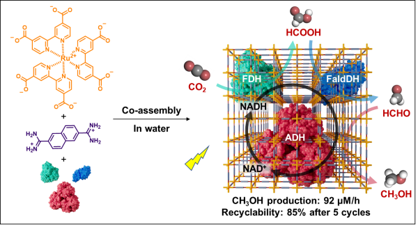 研究团队受羧酶体启发,通过水相中基于氢键相互作用的自组装,利用脒基单体、羧基单体与甲酸脱氢酶、甲醛脱氢酶及醇脱氢酶(ADH)的电荷增强氢键,通过原位一锅法共组装,实现基于多酶-光活性框架体系的人工光合系统制备。基于联吡啶钌基元的氢键有机框架,富集了光催化活性中心,能够在水相条件下实现高效的辅酶因子NAD+还原进而再生还原型辅酶Ⅰ(NADH),还原速率达4.5 mM/h